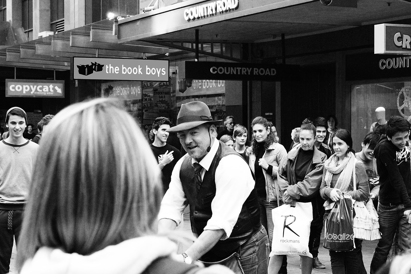 On Pulteney Street in Adelaide, I had crouched down and looked up at this man and as I took his image this was his expression.